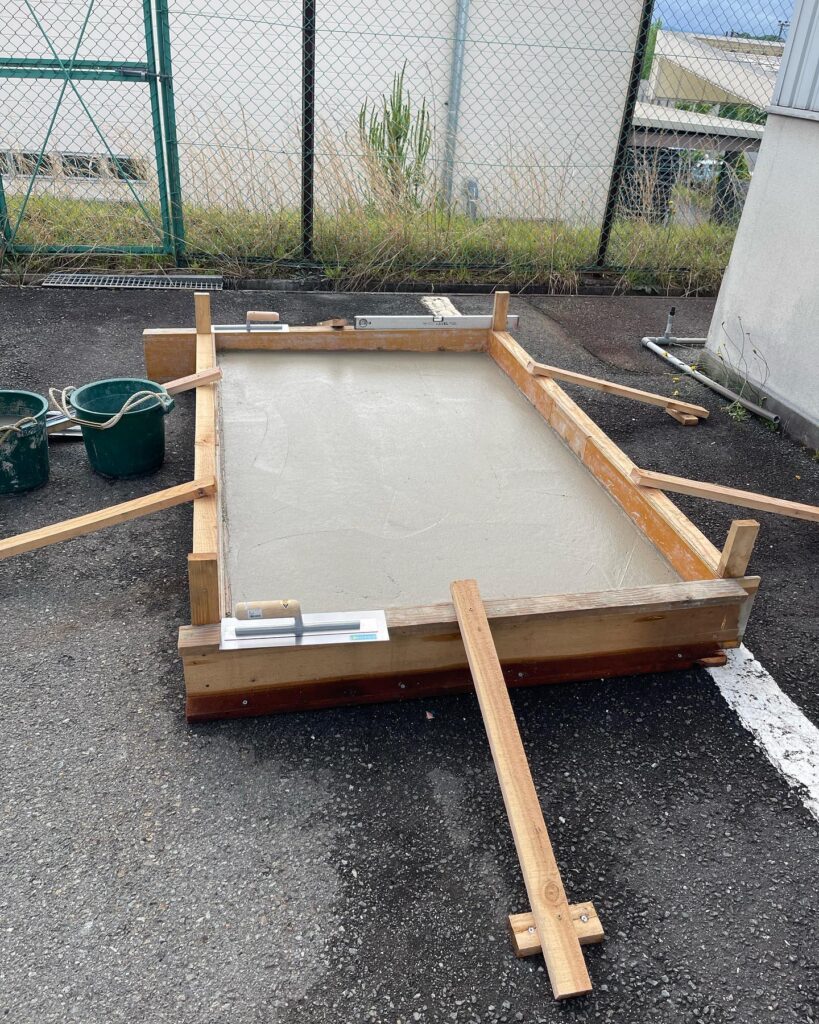 施工当日は生憎の土砂降りでしたが、型枠の設置は雨の中でも丁寧に進め、コンクリートの打設タイミングには雨が上がり、無事に施工を完了することができました。